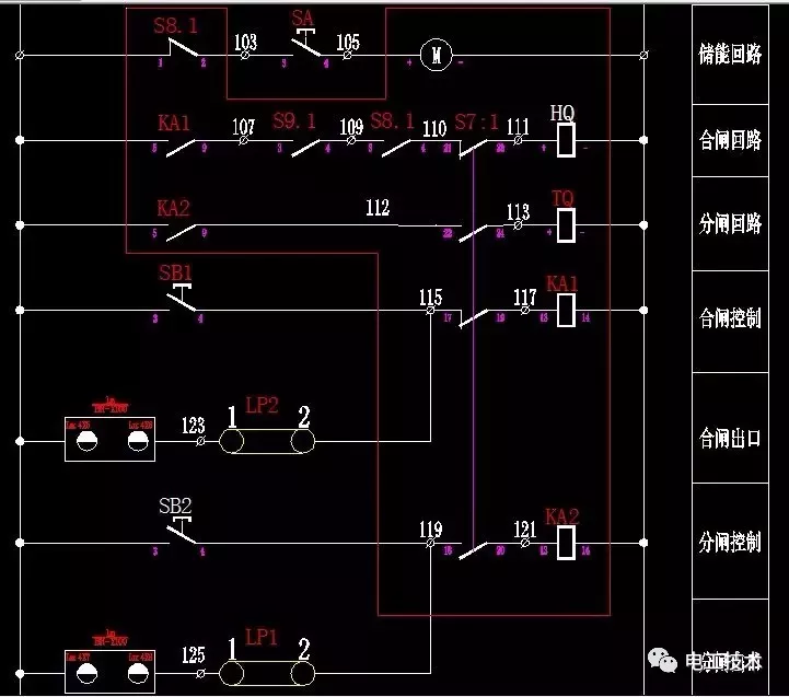所以在該圖上按下合閘按鈕SB1,首先繼電器KA1會(huì)得電吸合,吸合后合閘回路KA1常開(kāi)觸點(diǎn)會(huì)變常閉狀態(tài),如果確認(rèn)下門已關(guān)好,隔離開(kāi)關(guān)處于合閘狀態(tài),接地開(kāi)關(guān)處于分閘狀態(tài),電機(jī)已儲(chǔ)能。此時(shí)合閘線圈得電工作,觸動(dòng)開(kāi)關(guān)合閘機(jī)構(gòu)位置,開(kāi)關(guān)合閘。所以我們?cè)诤喜簧祥l的情況下,首先要判斷所有的輔助觸點(diǎn)狀態(tài)(即接地開(kāi)關(guān)狀態(tài)、隔離開(kāi)關(guān)狀態(tài)、電機(jī)儲(chǔ)能狀態(tài)、下門關(guān)閉狀態(tài))由硬件設(shè)施到回去狀態(tài)去解決,相必會(huì)事半功倍。