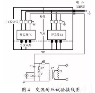 告知實(shí)驗(yàn)時(shí),交流耐壓值為出廠值的100% ,時(shí)間1 min。投運(yùn)后確診性實(shí)驗(yàn)時(shí),交流耐壓值為出廠值的80%,時(shí)間1 min。實(shí)驗(yàn)接線如圖4所示。