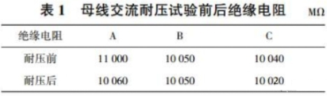 從耐壓實(shí)驗(yàn)進(jìn)程和表1絕緣電阻數(shù)據(jù)來看,該35kV 充氣柜母線耐壓實(shí)驗(yàn)合格。
