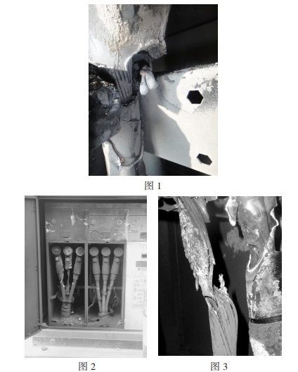2008年3月24日,回南天,富灣站富油乙線速斷跳閘,坐落戶外的一臺電纜分支箱發生短路爆炸(如圖1),601開關出線電纜倉門嚴峻熏黑,翻開后發現A相電纜終端應力錐焚毀,纜芯熔損,初步分析主要為施工工藝粗糙,構成電纜終端電場畸變嚴峻,一同纜身緊靠固定用金屬支架,在箱內潮濕環境下發生長時間閃絡放電,究竟絕緣破損接地短路,將出線套管炸壞,構成氣室漏氣,分支箱作廢。