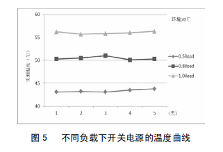 改進(jìn)后,為驗證改進(jìn)效果,對開關(guān)電源分別在0.5倍、0.8倍及1.0倍負(fù)載下進(jìn)行了為期5天的帶負(fù)荷試驗,圖5為不同負(fù)載下開關(guān)電源的溫度曲線,由圖5可知,隨著負(fù)荷的增大,開關(guān)電源問題總體呈上升趨勢;負(fù)載不變的情況下,同一溫度曲線基本保持平滑;開關(guān)電源在額定負(fù)載下運行,最高溫度不超過57℃,未達(dá)報警值,開關(guān)電源可靠性得到顯著提高。